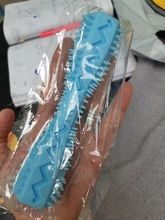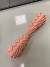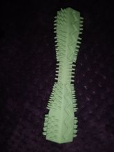 Gran juguete, caucho denso, casi no huele, no sé si hacer frente a la limpieza, al perro le gusta