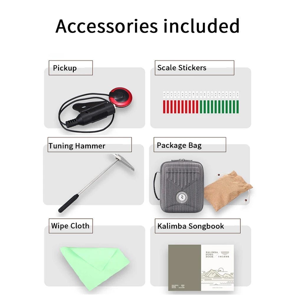 5. 【Prepárese para usar con el kit de kalimba todo en uno y servicio rápido a los clientes】Este kit de kalimba incluye 1 x kalimba,1 x Pickup, 1 x Tuning Hammer ,1 x bolsa de almacenamiento, 1 x cancionero de música, 1 x pegatina de escala, 1 x paño de limpieza, para que pueda jugar y mantener el Kalimba como un profesional.