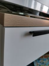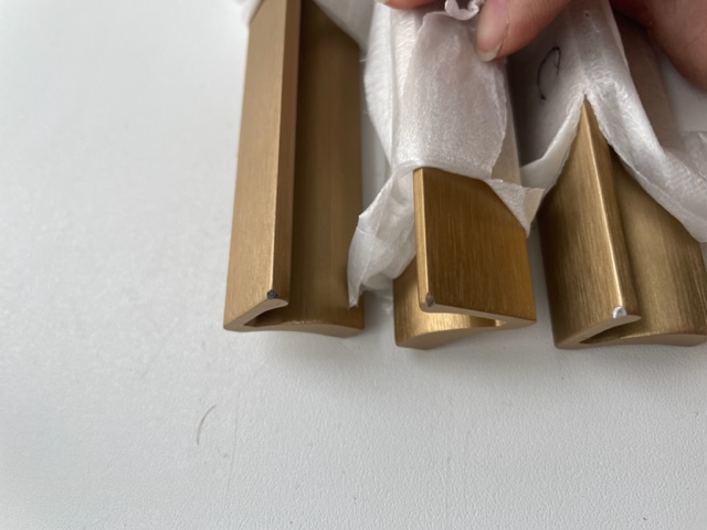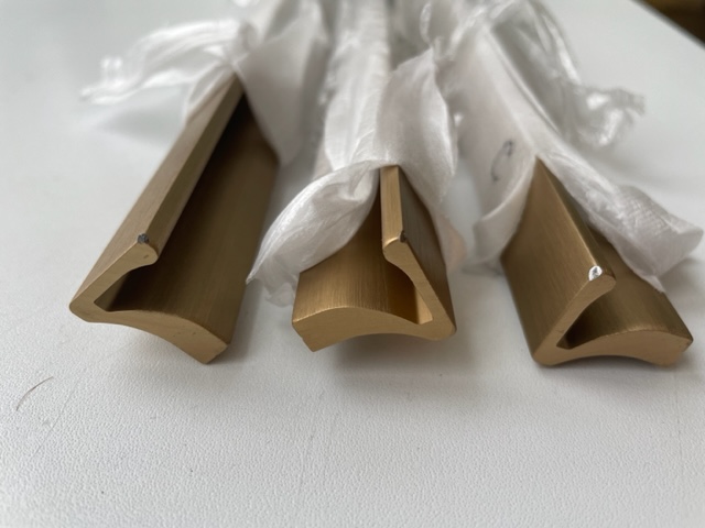 The widest and most massive cabinet handles that I found on the Internet, the color is dark gold, more like bronze, they did not match with other gold handles. The main disadvantage is either damaged during delivery (although the packaging is quite alive, not weak), or they are already packed, but out of 6 pieces, three came with knocked down edges. In the reviews I saw about this jamb, so I ordered with a margin. If black can be sanded and painted over with a marker, then this will not work for gold. In General, I recommend to buy, but take more, with a margin of damage during delivery. For furniture makers: on the handle 1000mm 3 screws, from the edge of 52mm and one in the center.
