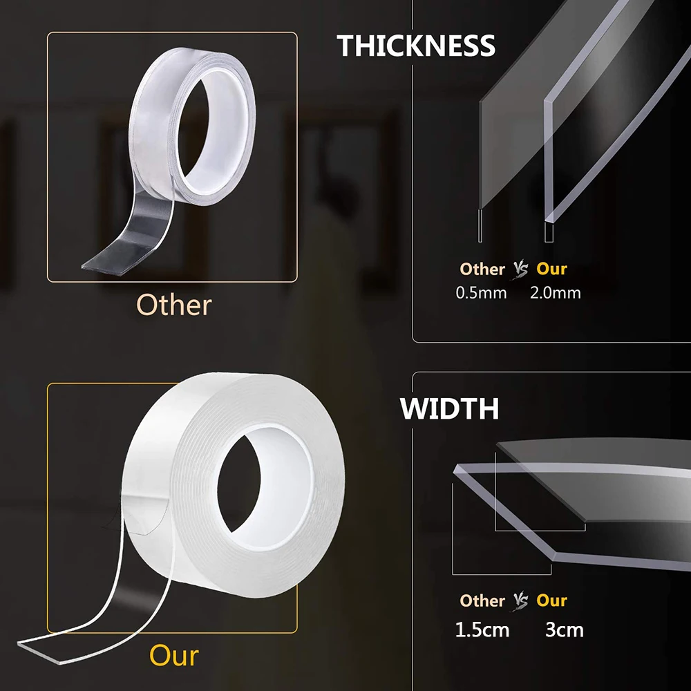 He estado buscando este 2mm cinta para un largo tiempo Los Ordinarios con un grosor de 1mm a sólo mintiendo objetos en un horizontal o ligeramente inclinado superficie Para colgar cosas que pela después de un tiempo y cuando distante. La cinta, por lo general, las lágrimas o se extiende y es inutilizable otra vez Por el contrario, tengo muy buena experiencia con 2mm cinta Lo mantiene más grande y los objetos más pesados en la pared. ¿No peel y puede ser utilizado en varias ocasiones después de pelar y enjuague con agua ¡Un pequeño pedazo de cinta es suficiente! Paga a más en stock ¿Genial para mí?