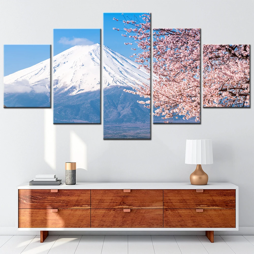 Pinturas en lienzo de Arte de pared para interiores, cuadro de flor de cerezo Mt Fuji, decoración moderna del hogar, póster, decoración estética de la habitación, 5 paneles