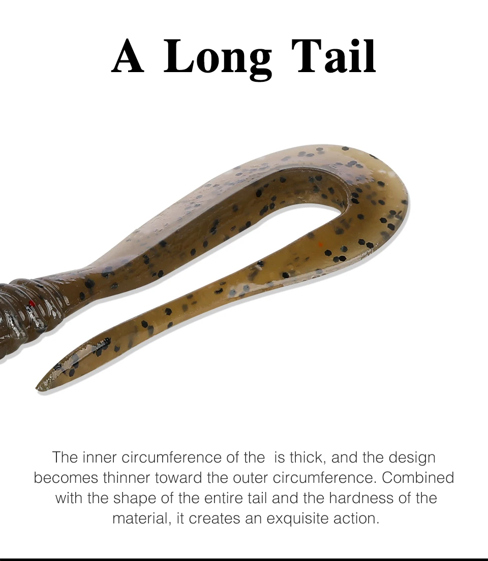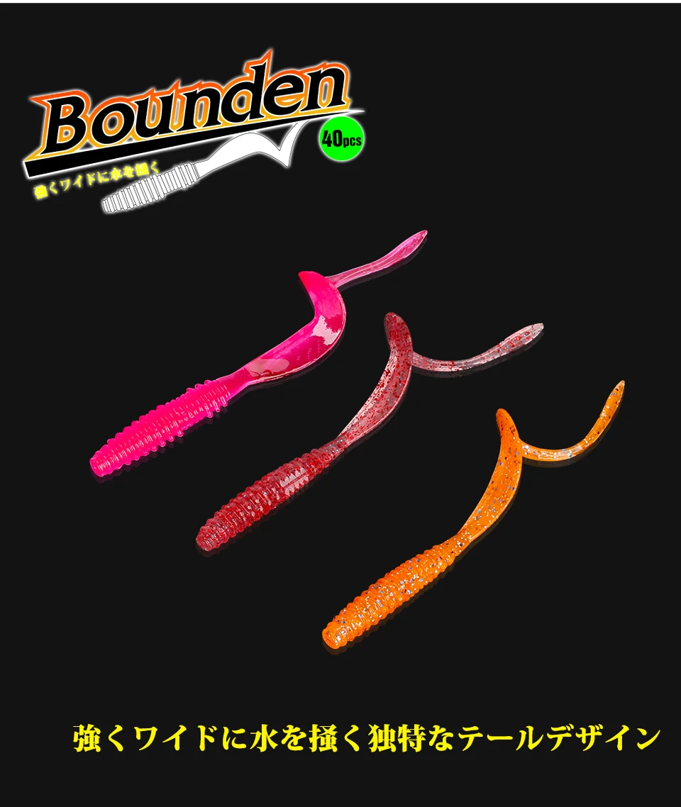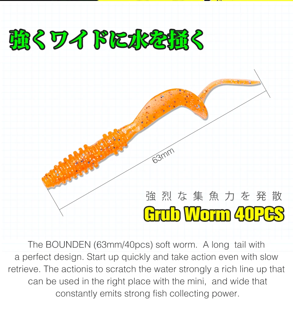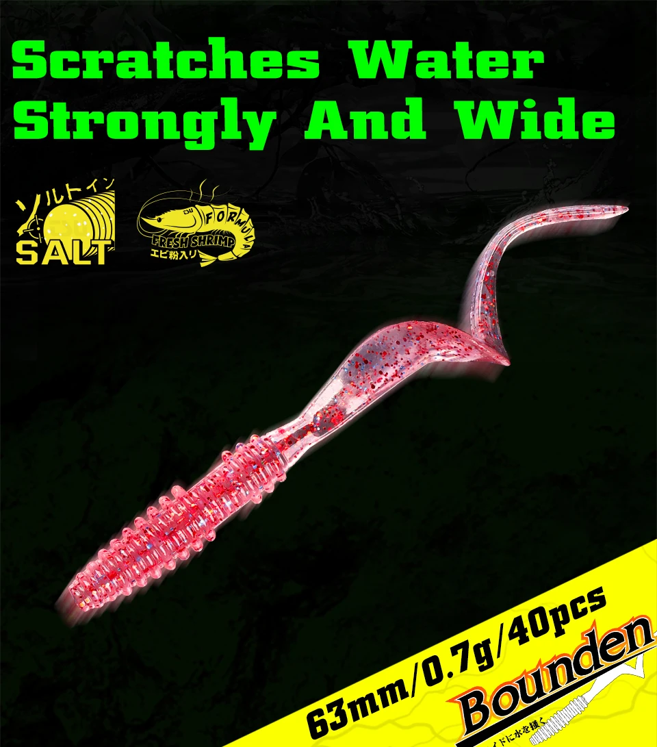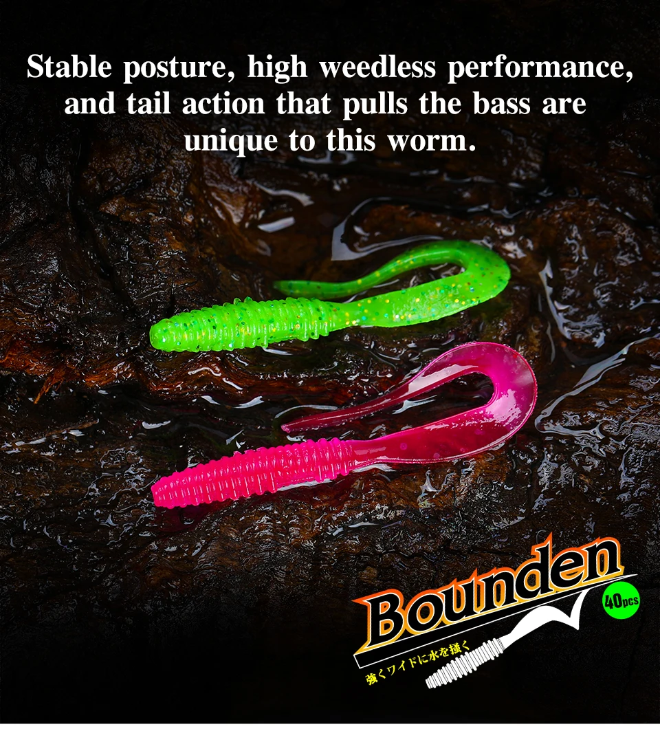 The BOUNDEN Soft Worm. A long tail with a perfect design. Start up quickly and take action even with slow retrieve. The action is to scratch the water strongly A rich lineup that can be used in the right place with the mini, and wide that constantly emits strong fish collecting power.