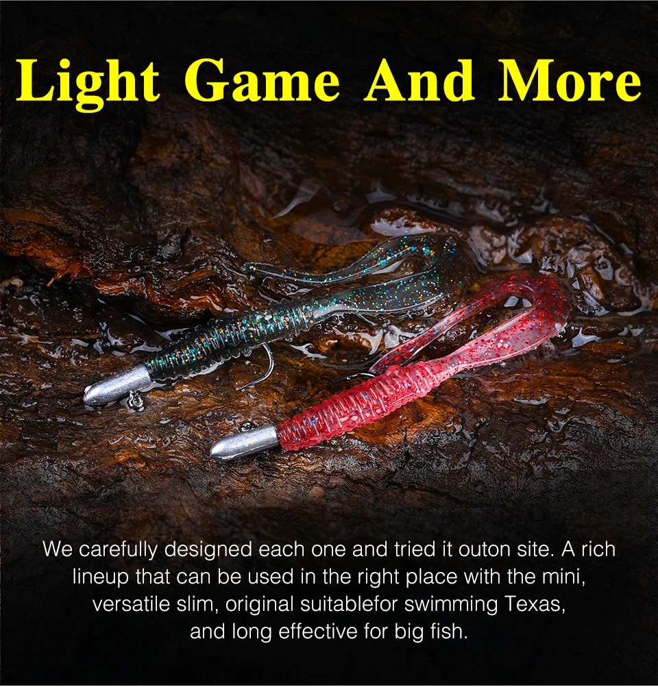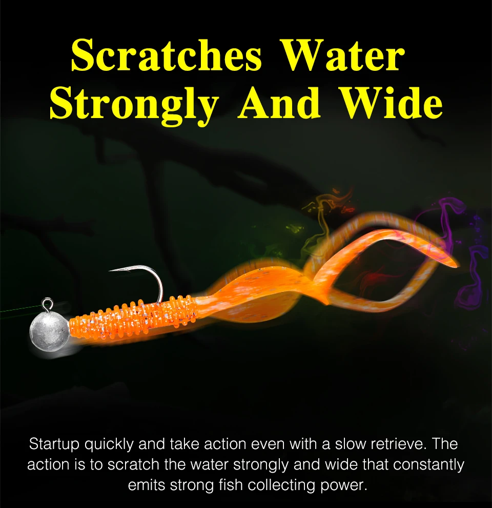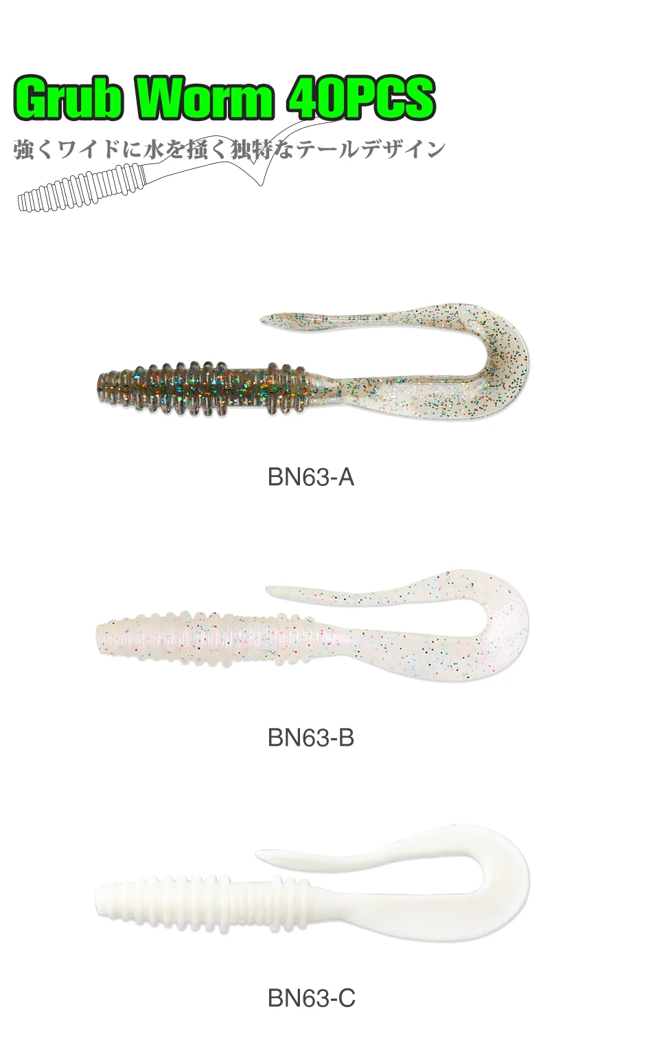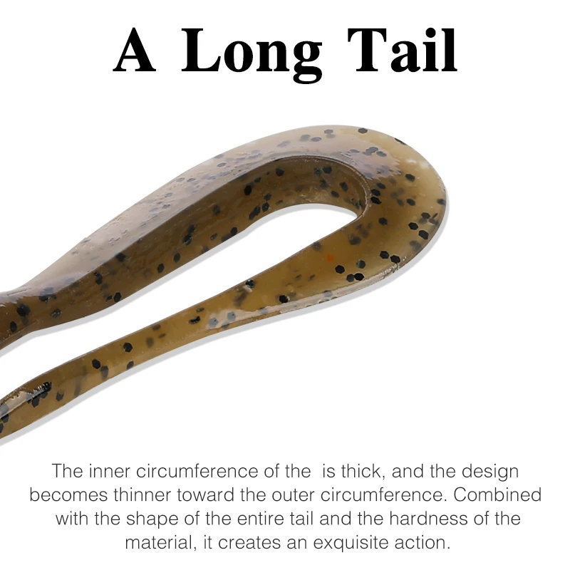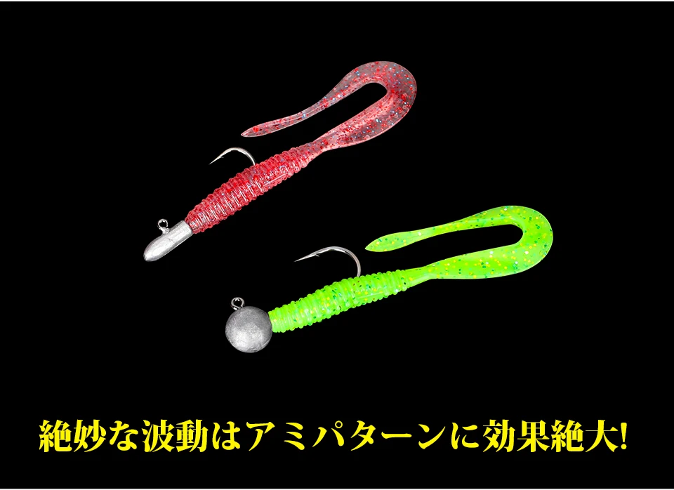 The BOUNDEN Soft Worm. A long tail with a perfect design. Start up quickly and take action even with slow retrieve. The action is to scratch the water strongly A rich lineup that can be used in the right place with the mini, and wide that constantly emits strong fish collecting power.