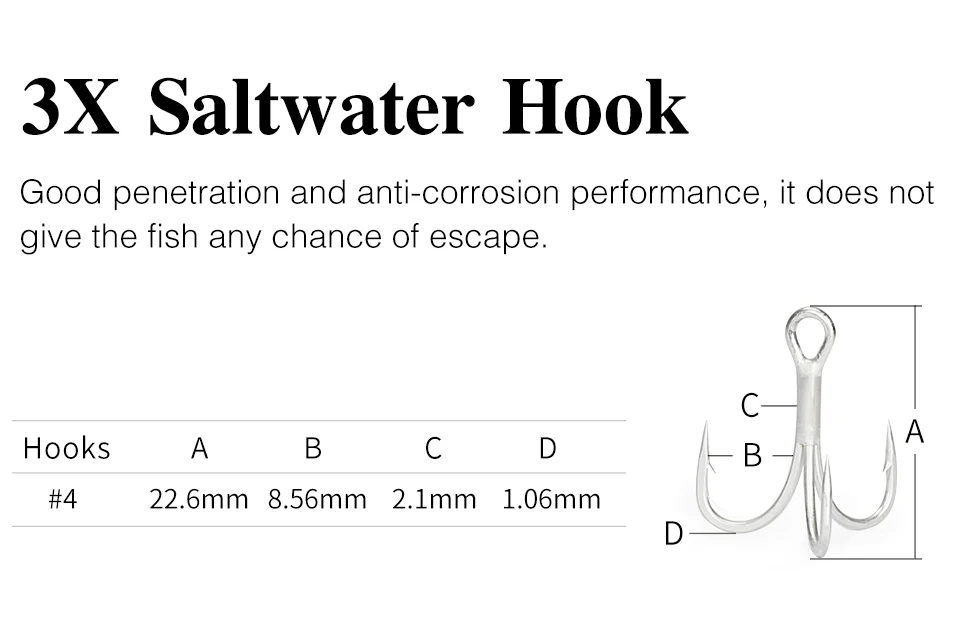 • 3 anzuelos de agua salada. Con buena penetración y rendimiento anticorrosión, no le da al pez ninguna posibilidad de escape.