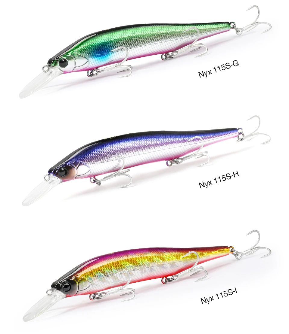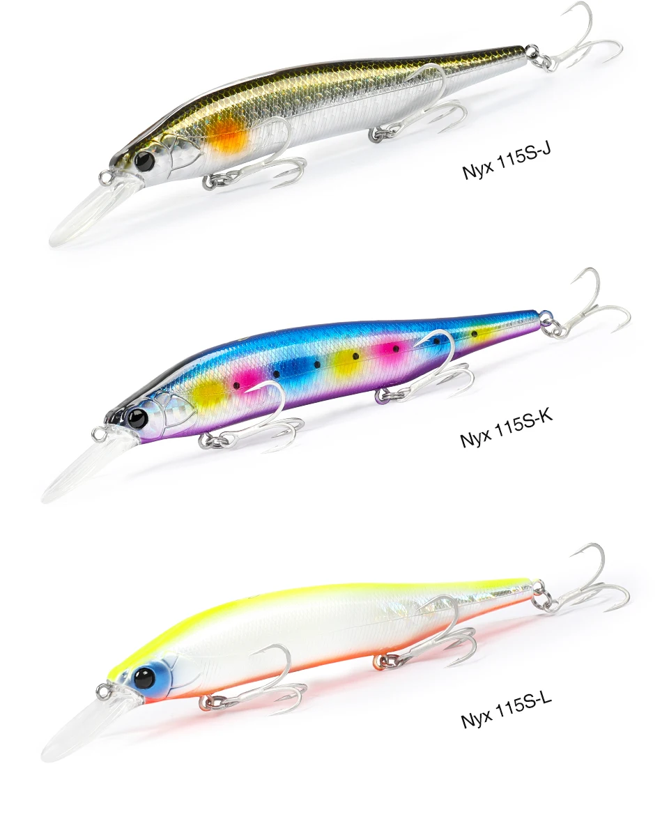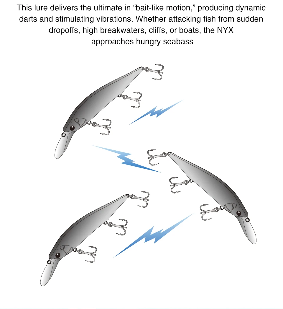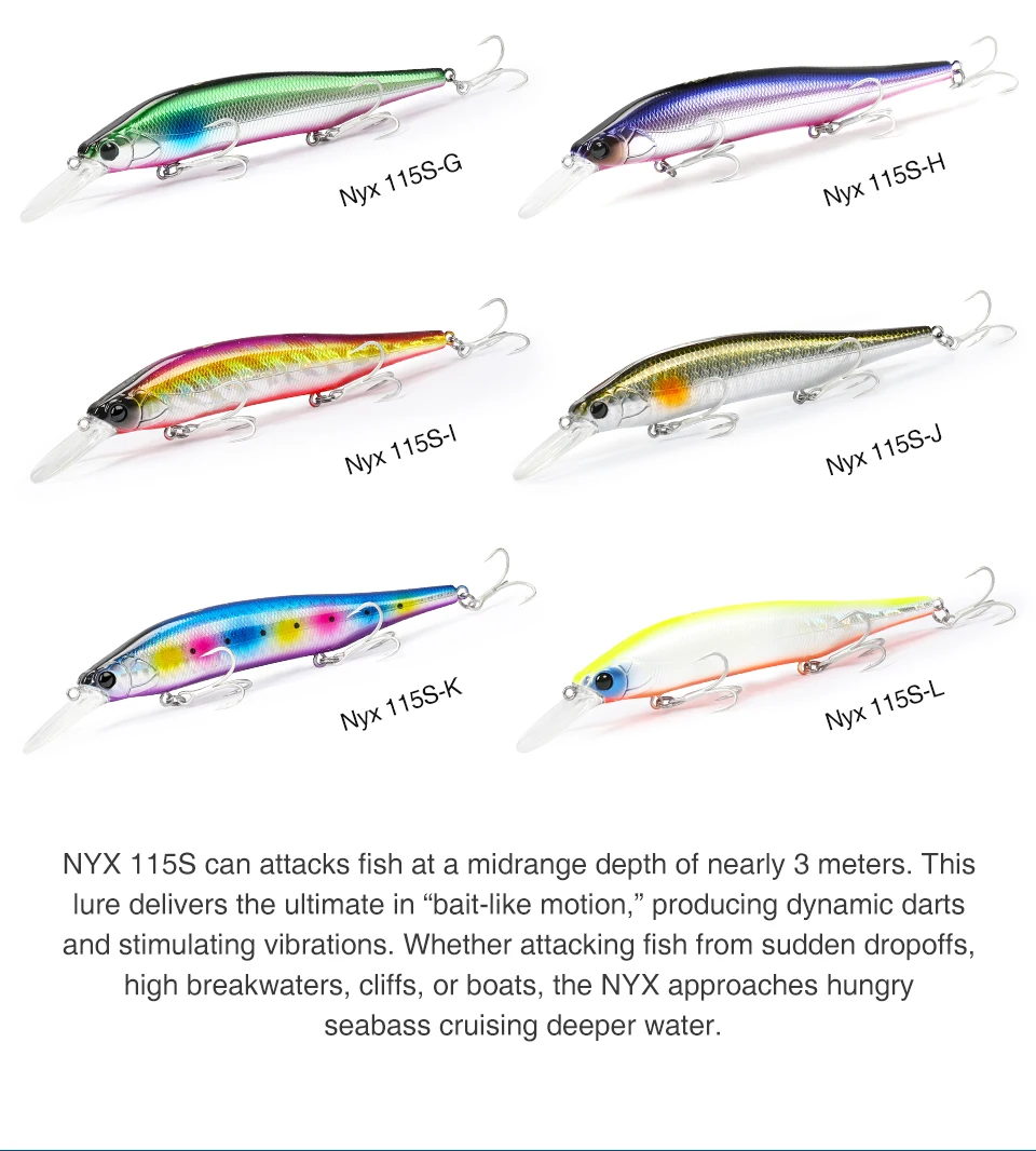 NYX 115S puede atacar peces a una profundidad media de casi 3 metros. Este señuelo ofrece lo último en «Movimiento tipo cebo», produciendo dardos dinámicos y vibraciones estimulantes. Ya sea atacando peces de caídas repentinas, rompeolas altos, acantilados o barcos, el NYX se acerca al crucero de lubina hambrienta