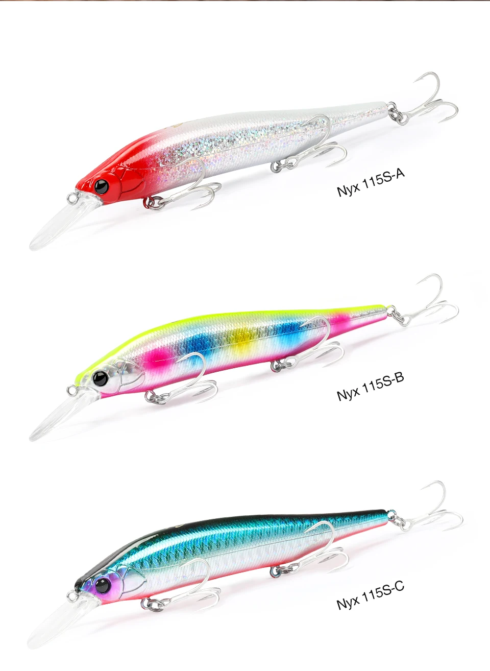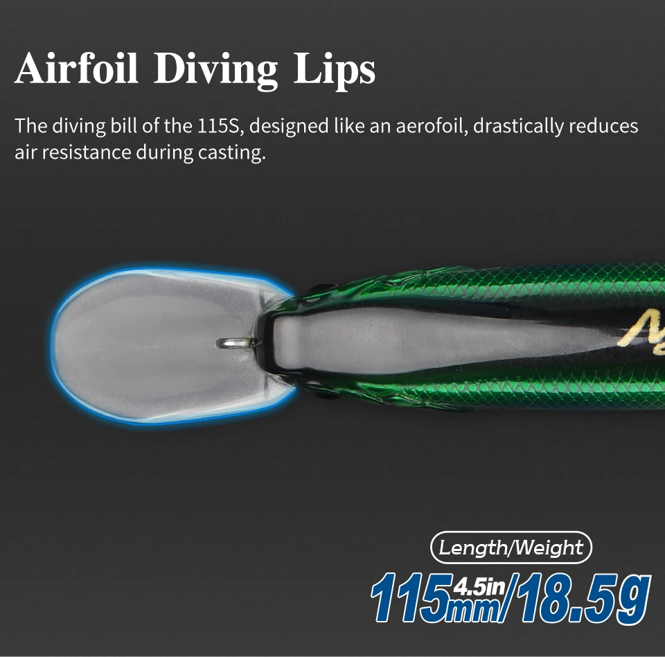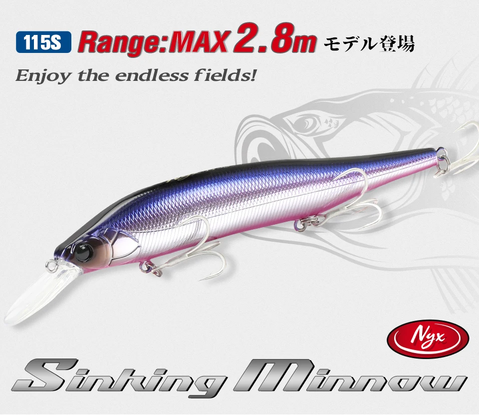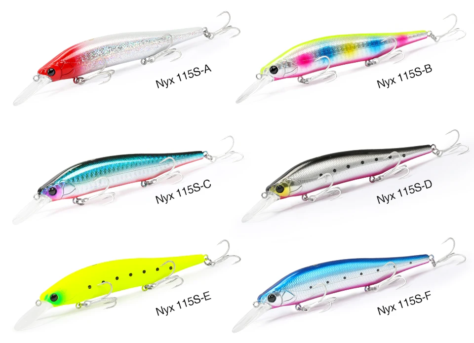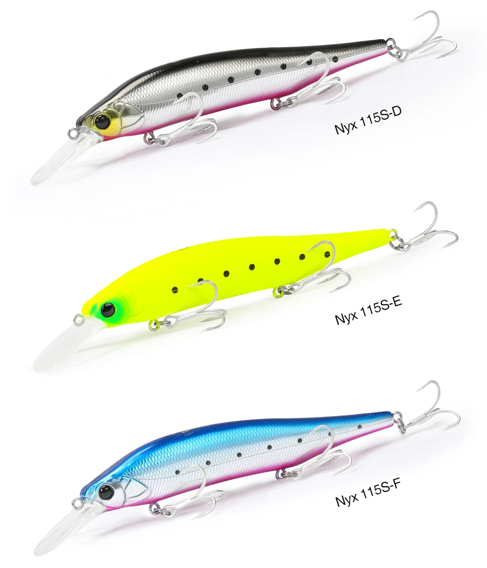 NYX 115S puede atacar peces a una profundidad media de casi 3 metros. Este señuelo ofrece lo último en «Movimiento tipo cebo», produciendo dardos dinámicos y vibraciones estimulantes. Ya sea atacando peces de caídas repentinas, rompeolas altos, acantilados o barcos, el NYX se acerca al crucero de lubina hambrienta