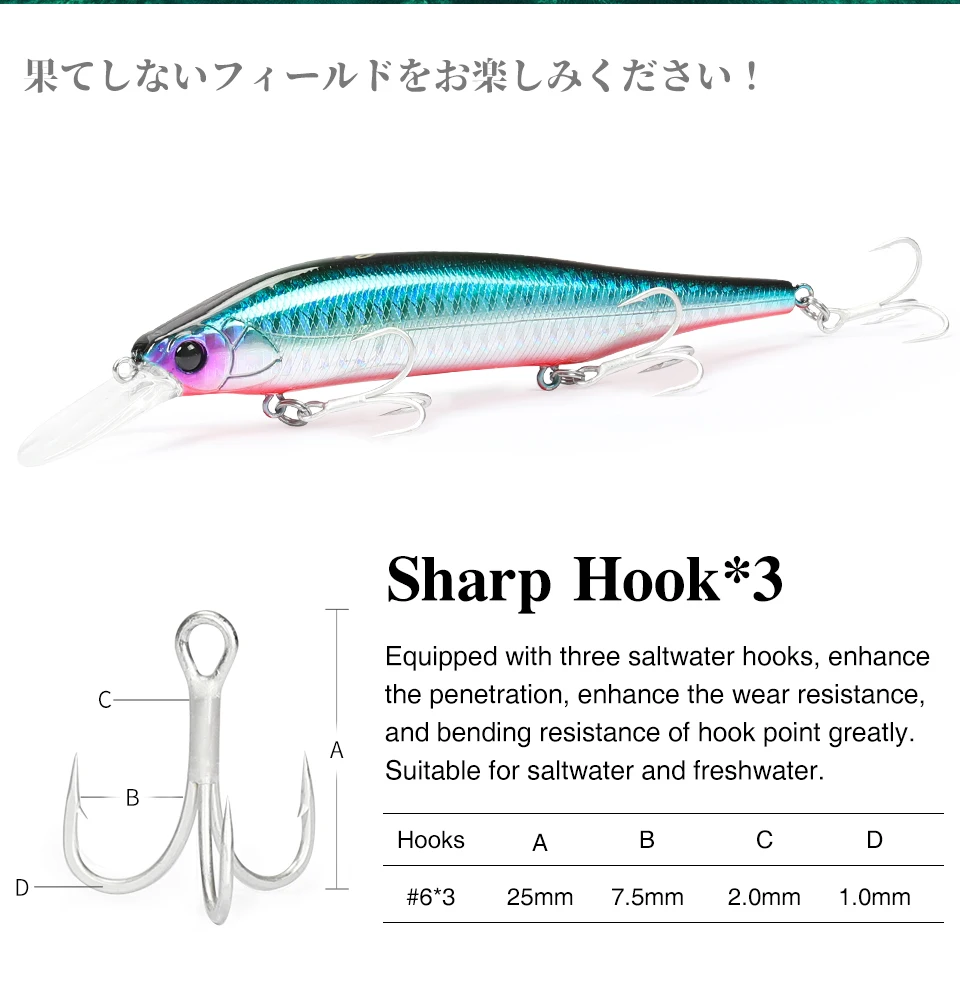 Equipado con tres ganchos de agua salada, mejora la penetración, mejora la resistencia al desgaste y la resistencia a la flexión del punto de gancho en gran medida. Adecuado para agua salada y agua dulce.