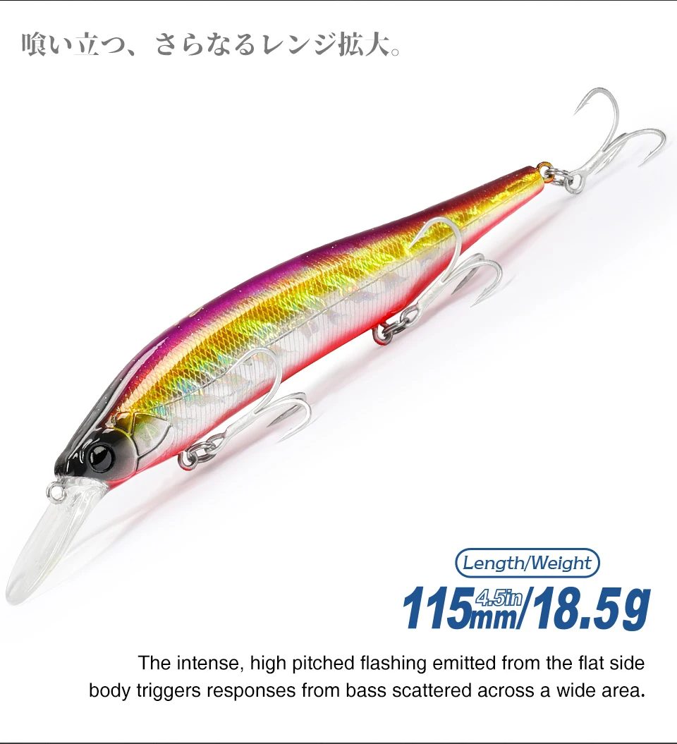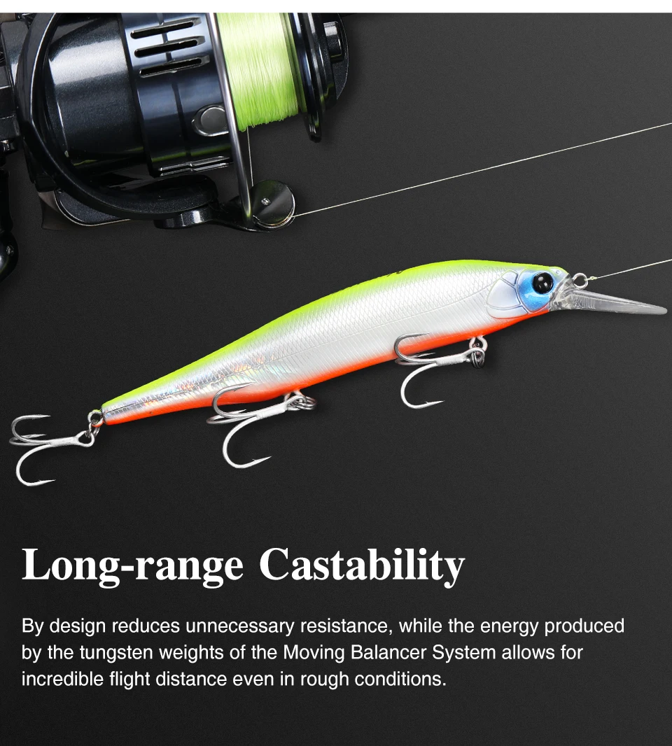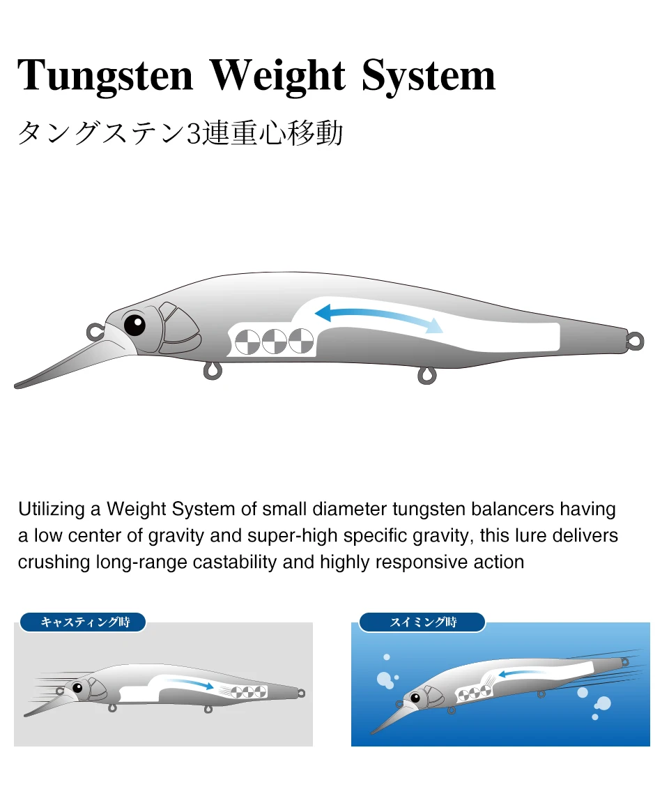 Utilizando un sistema de peso de equilibradores de tungsteno de diámetro pequeño que tienen un centro de gravedad bajo y una gravedad específica súper alta, este señuelo ofrece una casabilidad de trituración de largo alcance y una acción altamente sensible