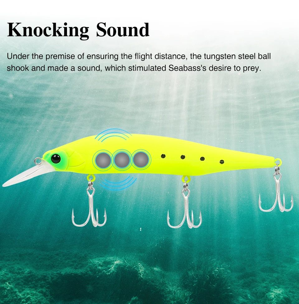 Bajo la premisa de asegurar la distancia de vuelo, la bola de acero de tungsteno se sacudió e hizo un sonido, lo que estimuló el deseo de presa de Seabass.