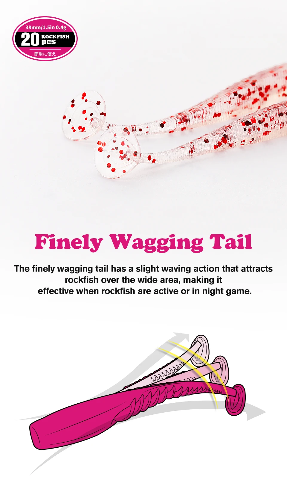 La cola que se mueve finamente tiene una ligera acción ondulante que atrae peces de roca en un área amplia.