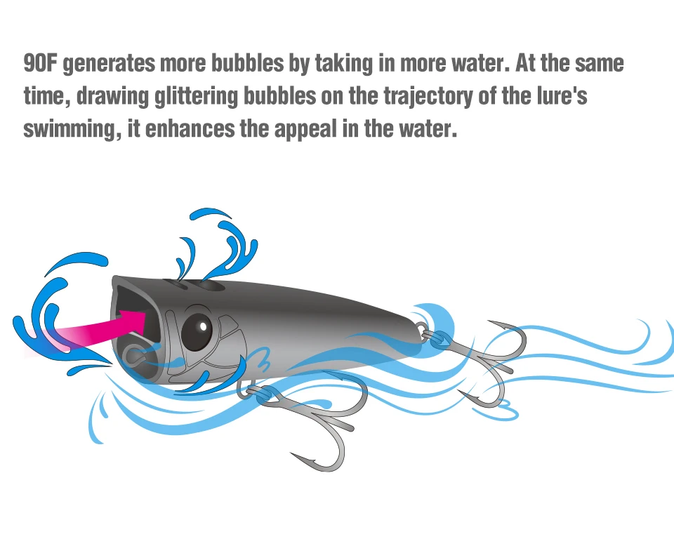 2. Fuerte atractivo: 90F genera más burbujas al absorber más agua. Al mismo tiempo, dibuja burbujas brillantes en la trayectoria de la natación del señuelo, mejora el atractivo en el agua
