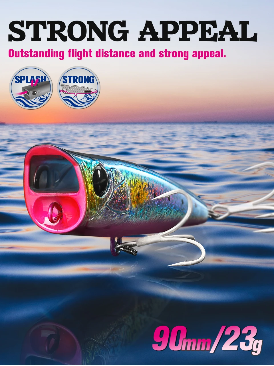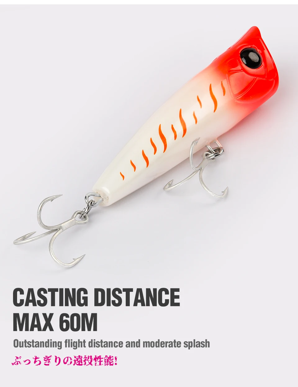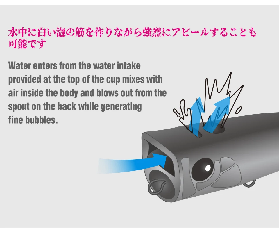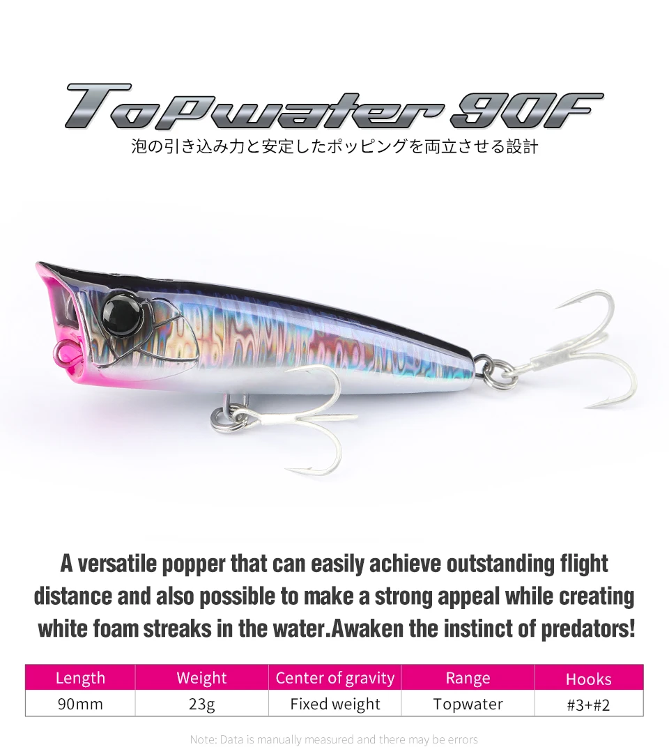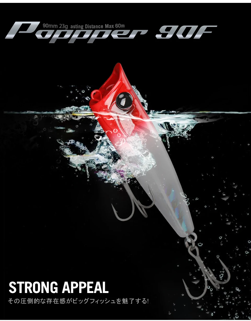 90F, un popper versátil que puede lograr fácilmente una distancia de vuelo excepcional y también es posible hacer un fuerte atractivo mientras crea rayas de espuma blanca en el agua. ¡despierta el instinto de los depredadores!