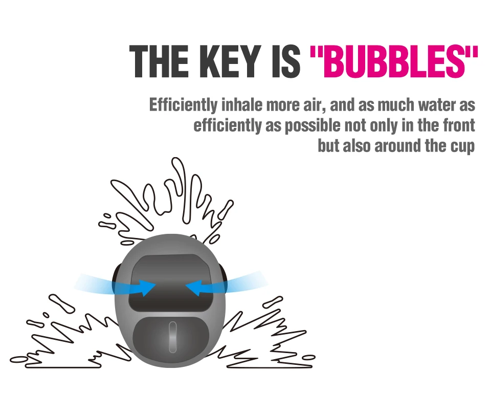 Inhale más aire de manera eficiente y la mayor cantidad de agua de manera más eficiente posible, no solo en la parte delantera sino también alrededor de la taza