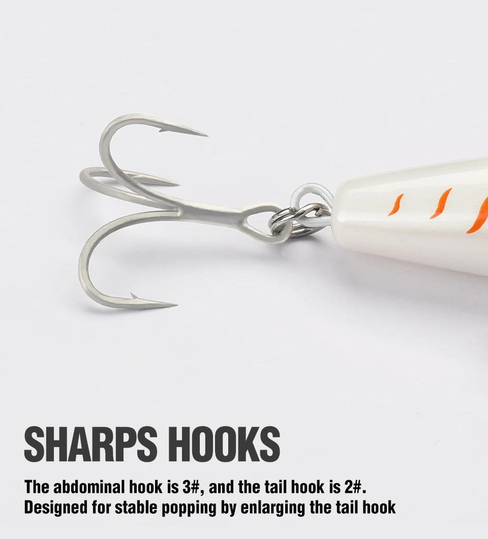 7. Ganchos de agua salada, buena penetración y rendimiento anticorrosión, no da a los peces ninguna oportunidad de escape. El gancho abdominal es 3 #, y el gancho de cola es 2 #. Diseñado para un estallido estable mediante la ampliación del gancho trasero