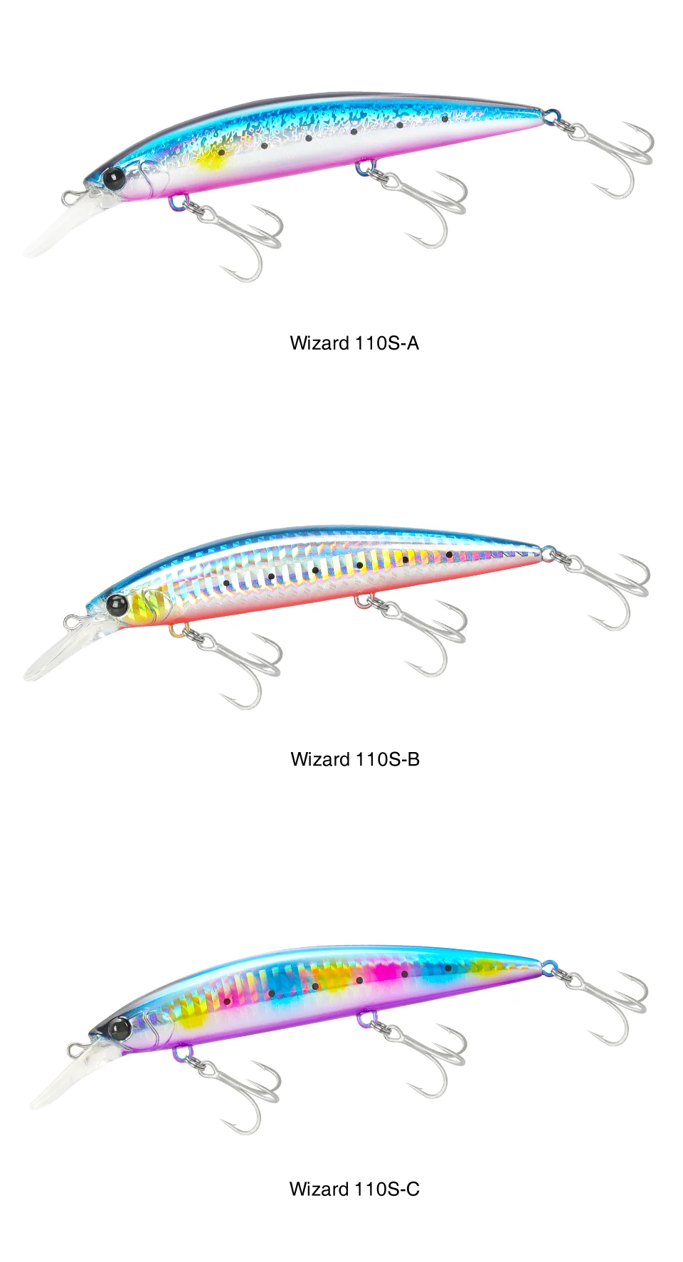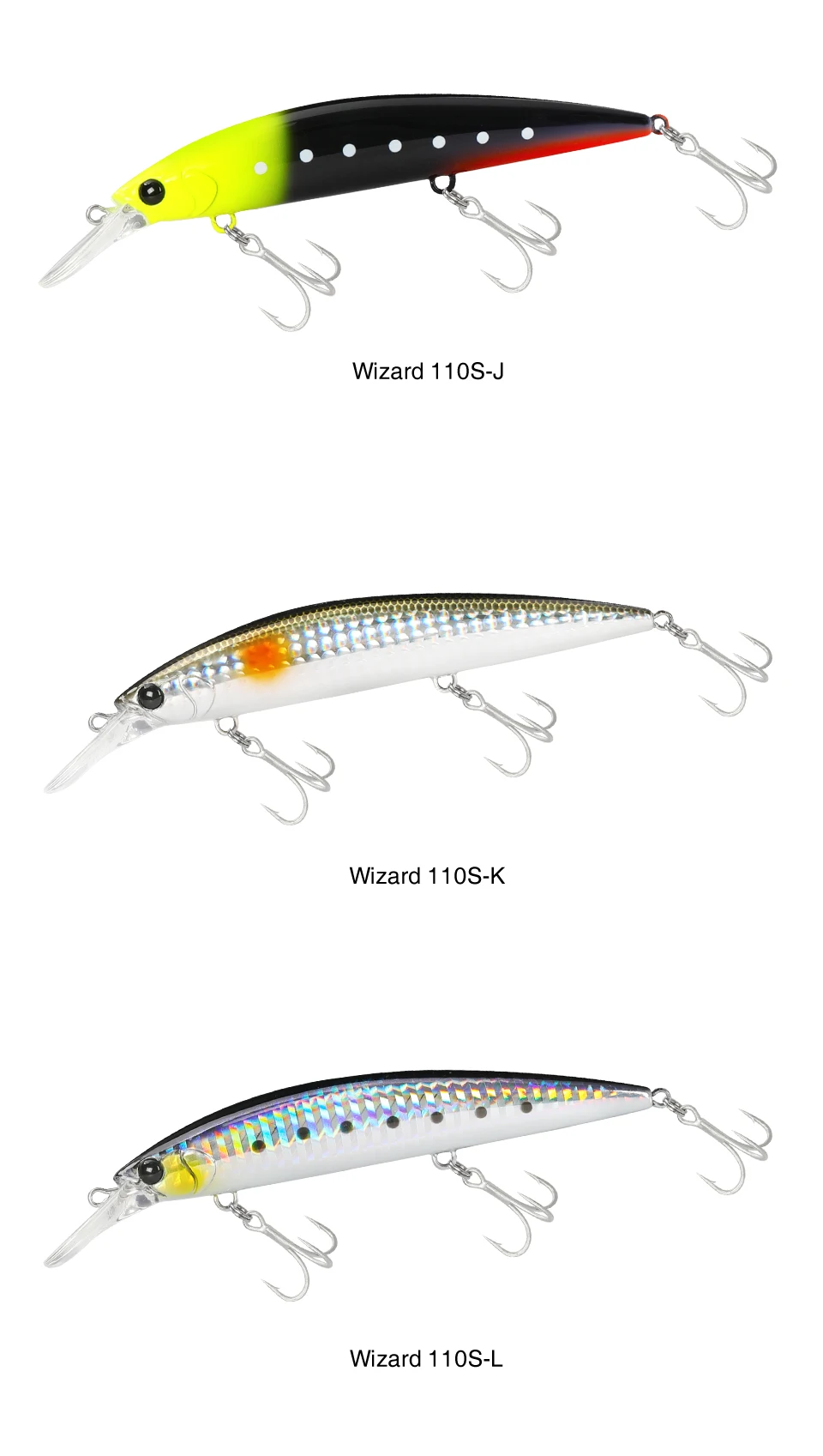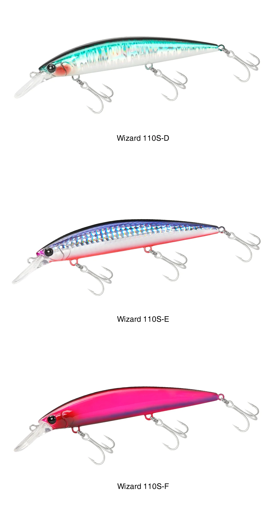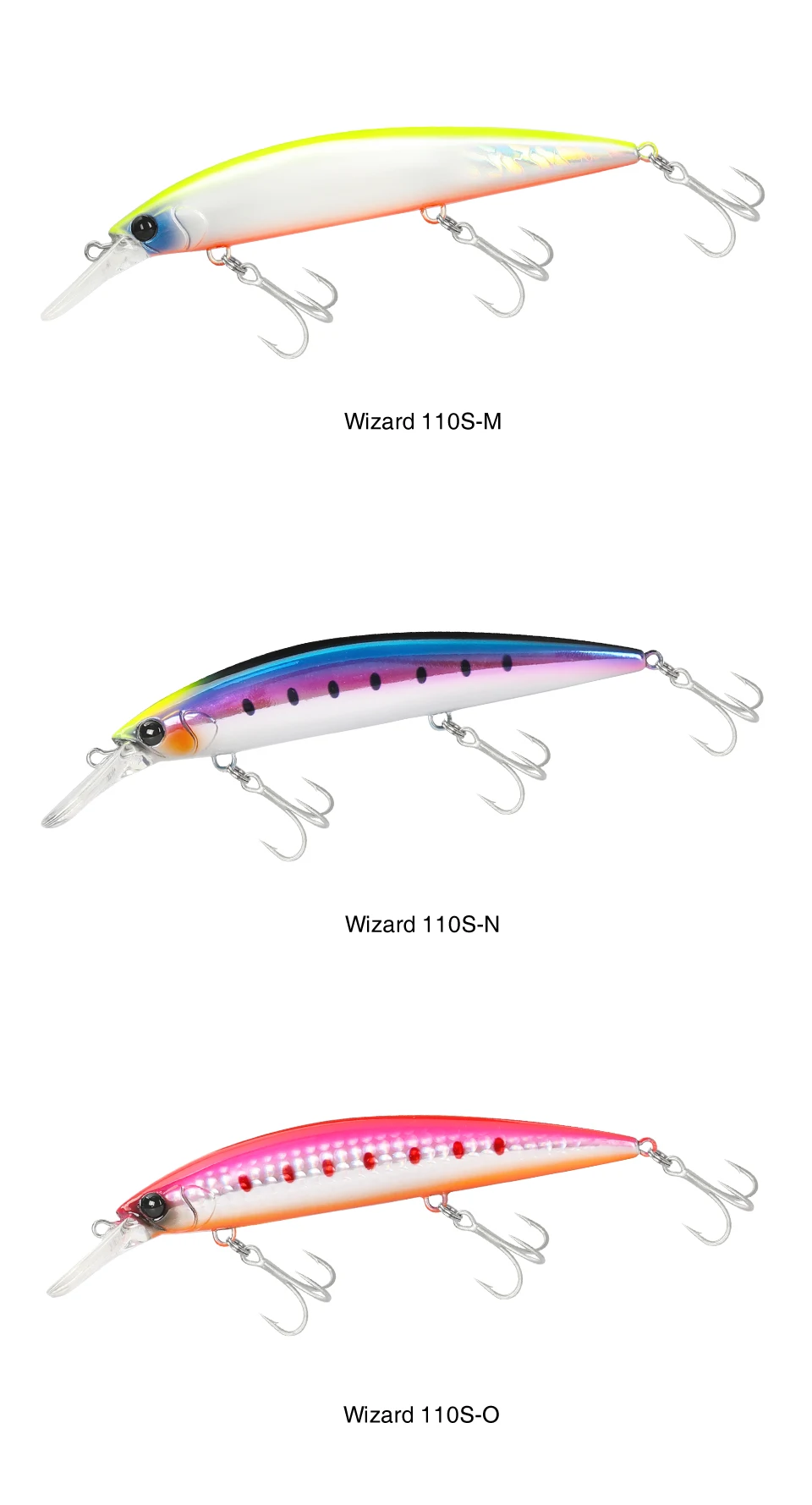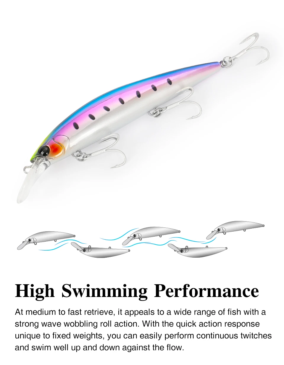 De recuperación media a rápida, atrae a varios peces con una fuerte acción de balanceo ondulante. Con la respuesta de acción rápida única de los pesos fijos, puede realizar fácilmente sacudidas continuas y nadar bien hacia arriba y hacia abajo contra el flujo.