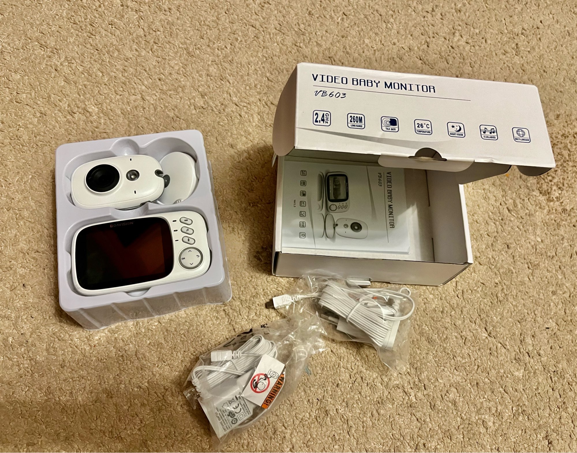 La orden llegó muy rápido. Buena Cámara, corresponde a la descripción del vendedor. Incluye la cámara en sí, unidad parental con pantalla, instrucción en inglés y 2 cables de alimentación. La Cámara en sí tiene varias opciones de fijación, se puede colocar horizontalmente, se puede fijar verticalmente (hay un agujero). La Cámara solo funciona desde el cable de alimentación, el cable en sí es lo suficientemente largo. La unidad parental se puede cargar desde el cable y funcionará con una batería cargada. La calidad de la imagen es bastante buena, hay un modo de sueño que se activa en movimiento o sonido. La imagen es un poco lenta, pero no creo que sea crítica. Hay cunas, pantalla de temperatura interior, 5 niveles de volumen (el último es muy fuerte). En realidad, todavía no se ha utilizado, esperando al bebé. Por su dinero es una cosa muy digna, gracias al vendedor, puede tomar y recomendar!